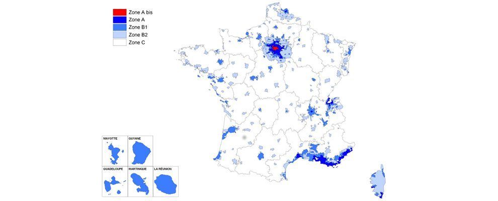 Zone A : agglomération de Paris (dont zone Abis), la Côte d’Azur, la partie française de l’agglomération genevoise, certaines agglomérations ou communes où les loyers et les prix des logements sont très élevés ;